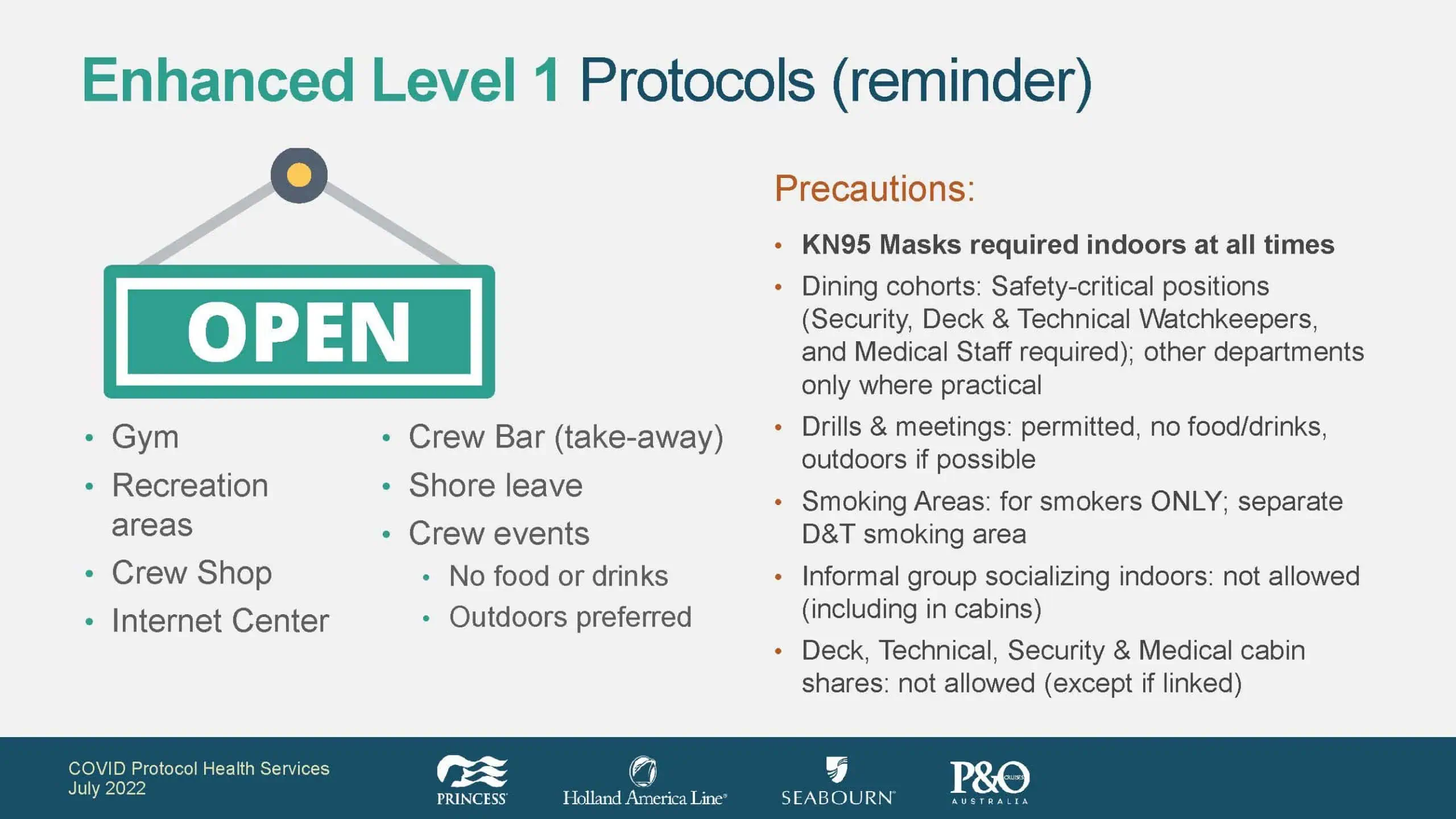As regulatory authorities continue to relax cruise industry COVID-19 regulations, our Global HESS protocols will be modified to provide greater flexibility and access for our team members to onboard amenities and services. Our goal is to return to a new normal while continuing to protect the health and safety of all those on board.